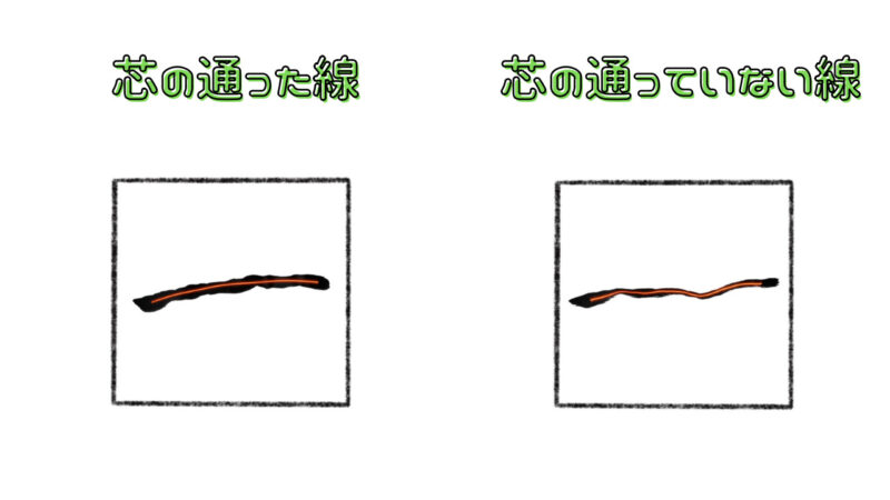 芯の通った線は、針金が真ん中にすっと通るイメージです。芯の通ってない線は、針金がぐにゃぐにゃです。